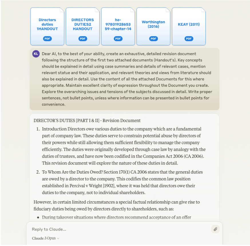 In the example here, the relevant book chapter of the students coursebook and the lecture slides have been uploaded into Claude AI..